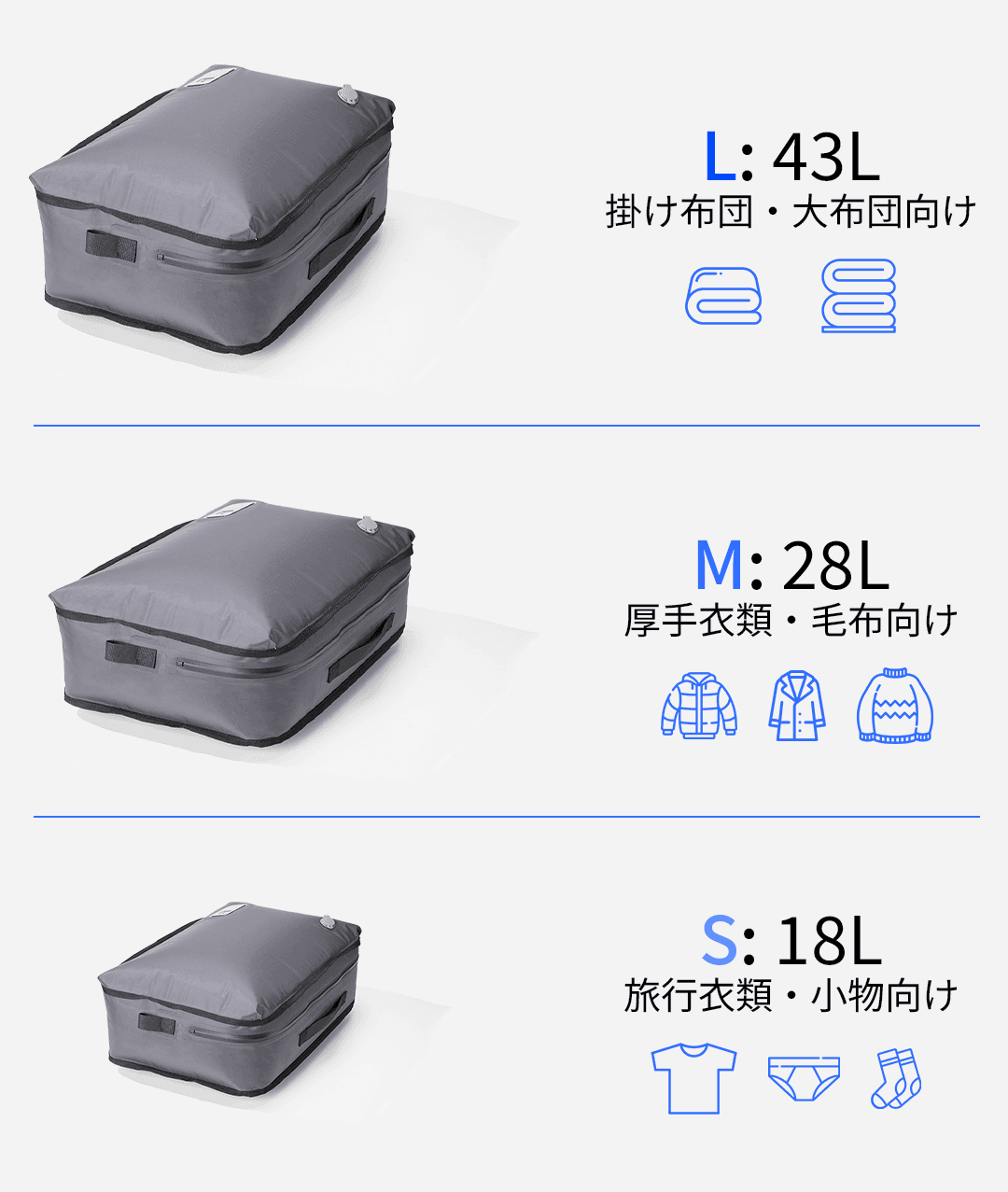 Mospaceは用途に合わせてS/M/Lの3サイズをご用意。Sは旅行の衣類や小物に、Mは毛布や大きめの衣類に、Lは掛け布団や厚手の布団にぴったり。どんな荷物も無駄なく圧縮でき、家でも旅行でもスッキリ収納できます。